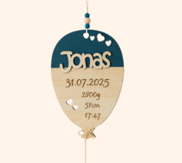 Dieses besondere Namensschild im Ballon-Design macht das Babyzimmer noch persönlicher. Der Name wird als erhabener Schriftzug gestaltet, die Geburtsdaten werden sauber eingraviert– ein zeitloses Erinnerungsstück für kleine Wunder.